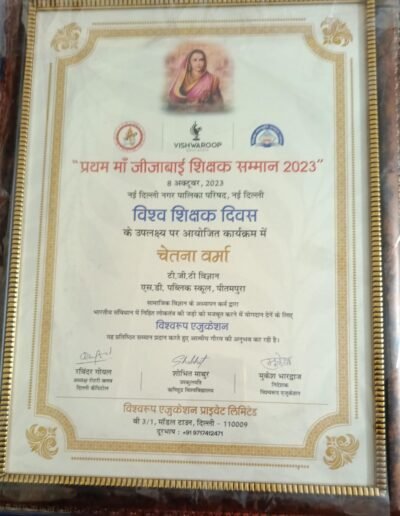 Ms. Anamika Jha, our science teacher has been awarded with “Shiksha Gaurav Award” 2020 by CED Foundation and GTE Foundation of India at Teacher Ambassador Ceremony held on 26 December 2020 at Gurugram .The Award was given away by Major Harsh Kumar,Secretary NCERT in the presence of Mr. P. Ravi ,former regional director , NIOS, Dr A.K. Sharma, Former Assistant Commissioner, KVS and Dr. Priyadarshi Nayak ,founder GTE Foundation.