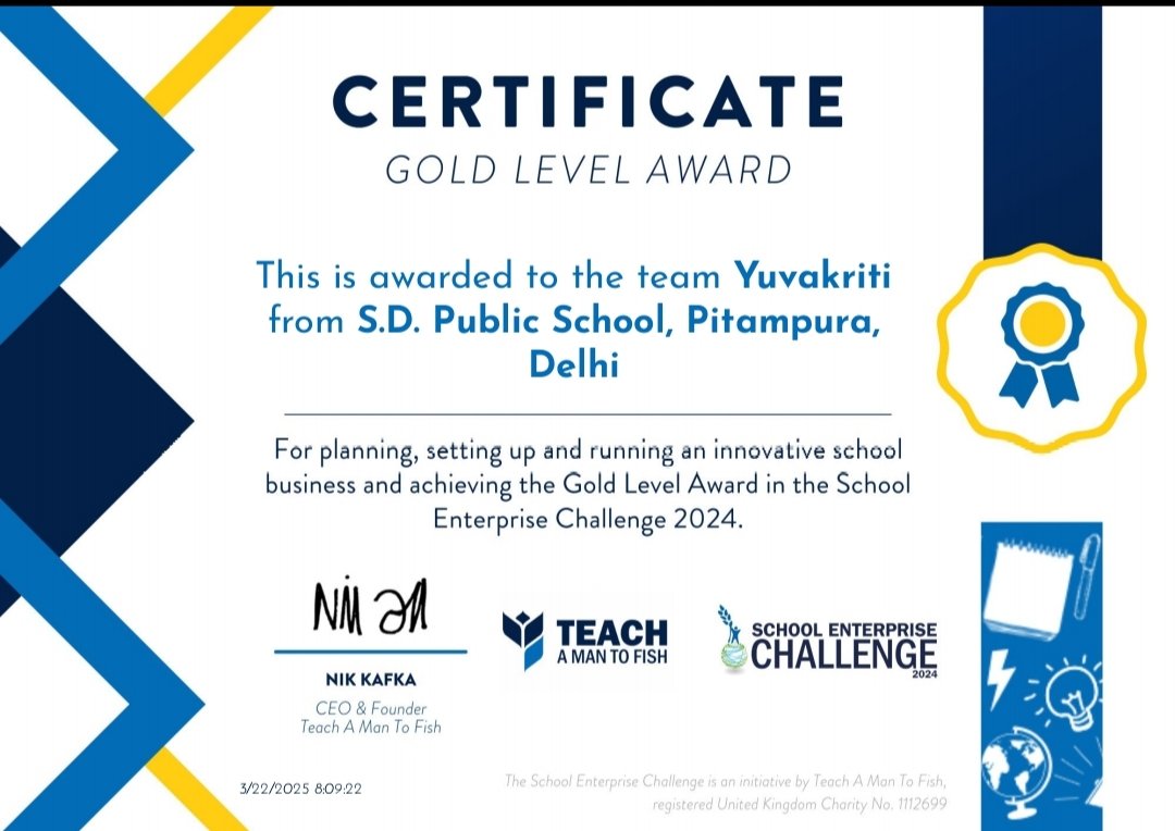 Team Yuvakriti from S.D. Public School, Pitam Pura, has been honored with the prestigious Gold Level Award by the School Enterprise Challenge, an initiative of Teach a Man to Fish (UK). This recognition highlights the team’s exceptional efforts in promoting skill development and fostering an entrepreneurial mindset among the youth.