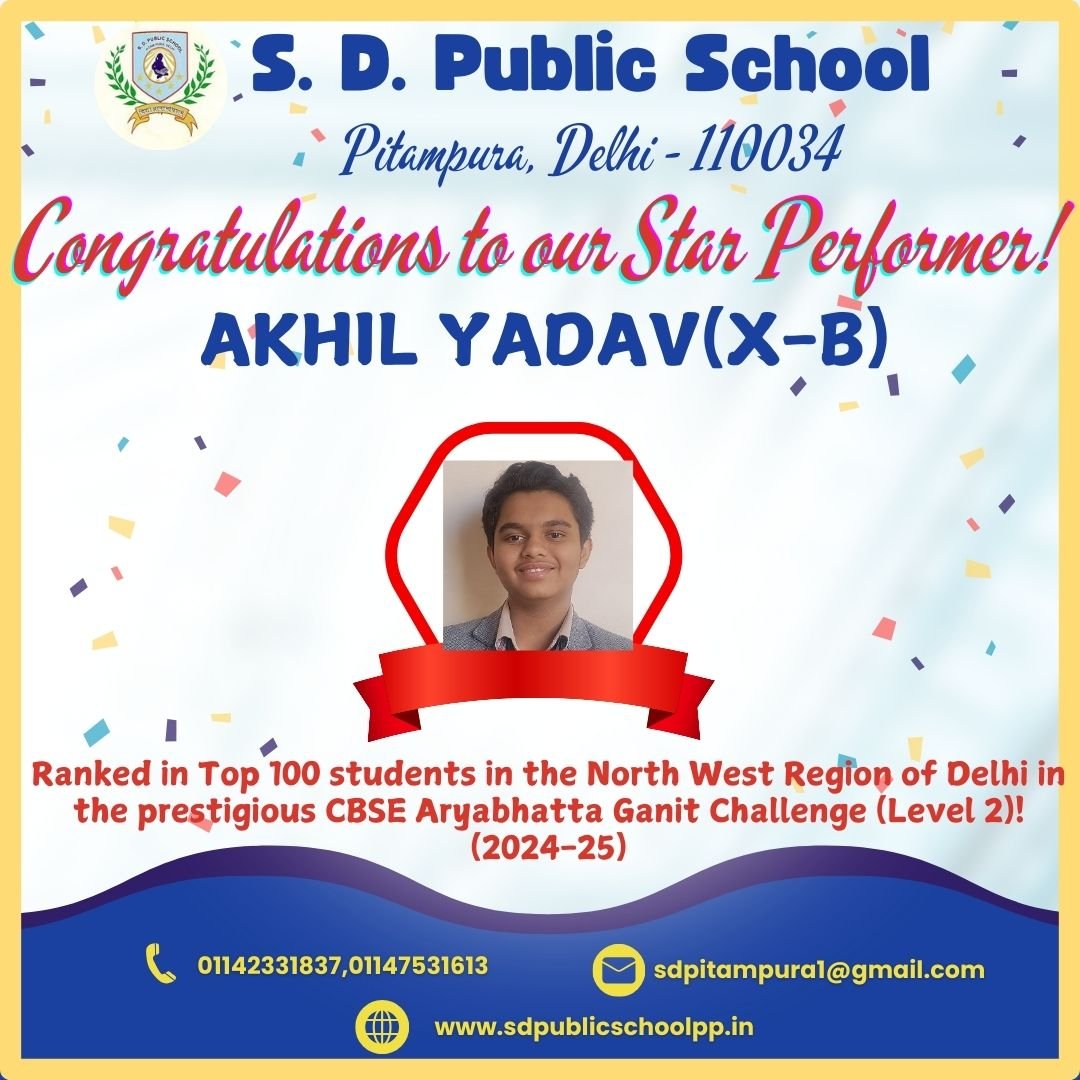 We are thrilled to announce that Akhil Yadav of X B from S.D. Public School, Pitampura has achieved an outstanding milestone by securing a place among the Top 100 students in the North West Region of Delhi in the prestigious CBSE Aryabhata Ganit Challenge (Level 2)!