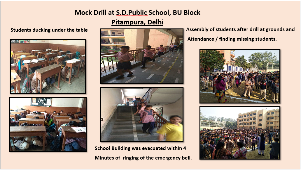 A mock drill was conducted in the school premises. All the Students and staff members of the school evacuated the building within 3.4 minutes of the emergency bell. Everyone followed the school evacuation plan and route. Students practiced Drop-Cover-Hold before the evacuation exercise.